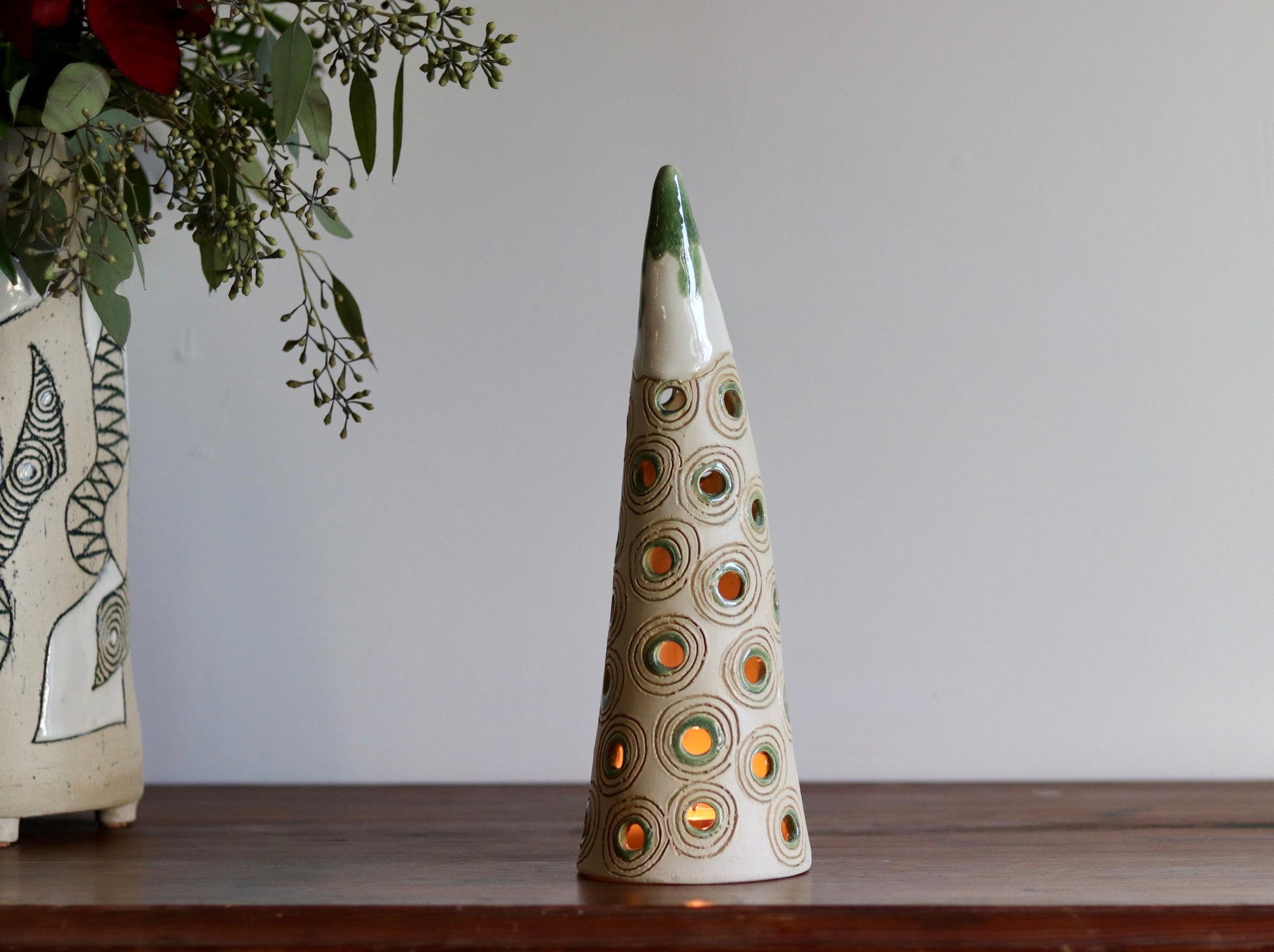 The tree lantern house has been fired at high temperature and can easily withstand the heat of the candle. It is also safe to be placed outside if you prefer to watch it shine and glimmer in the snow.