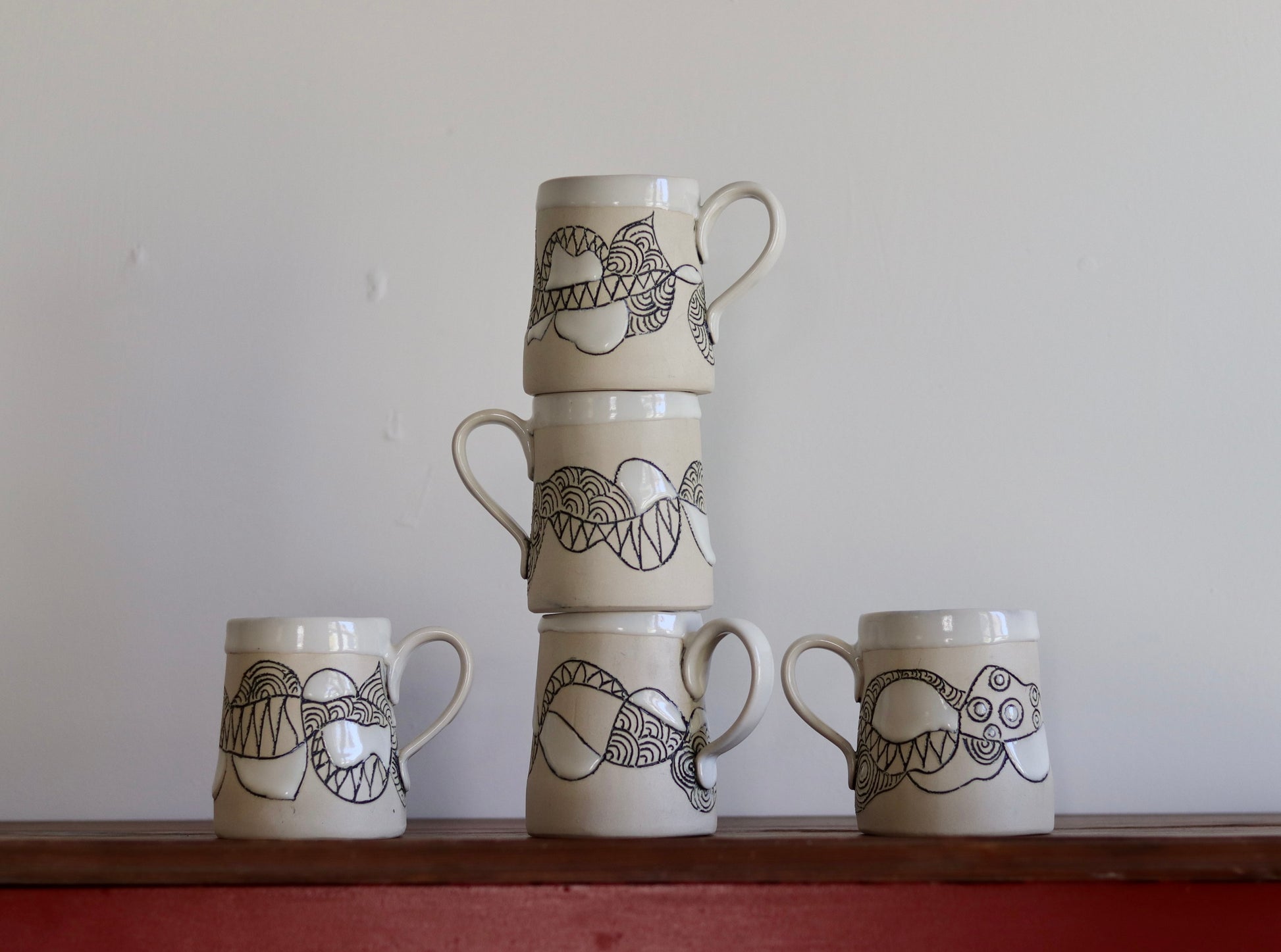 Made from a smooth white stoneware, these mugs are created individually with not two being exactly alike. The scale design is incised freehand just before leather hard. Celebrating the difference between each mug some have a larger incised portion with a smaller glazed rim and others have less of the scale design and more of a glazed rim. All mugs are glazed white inside.