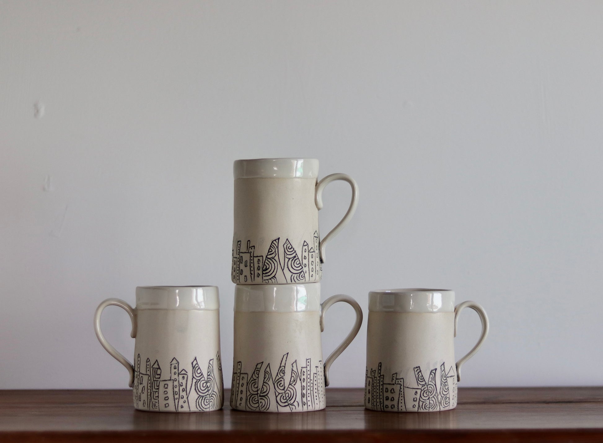 Made from a smooth white stoneware, these mugs are created individually with not two being exactly alike. The cityscape pattern is incised freehand when the piece is leather hard. Celebrating the singularity of each mug, and of each city and town, makes every cityscape and every mug unique in its design. All mugs are glazed white inside.