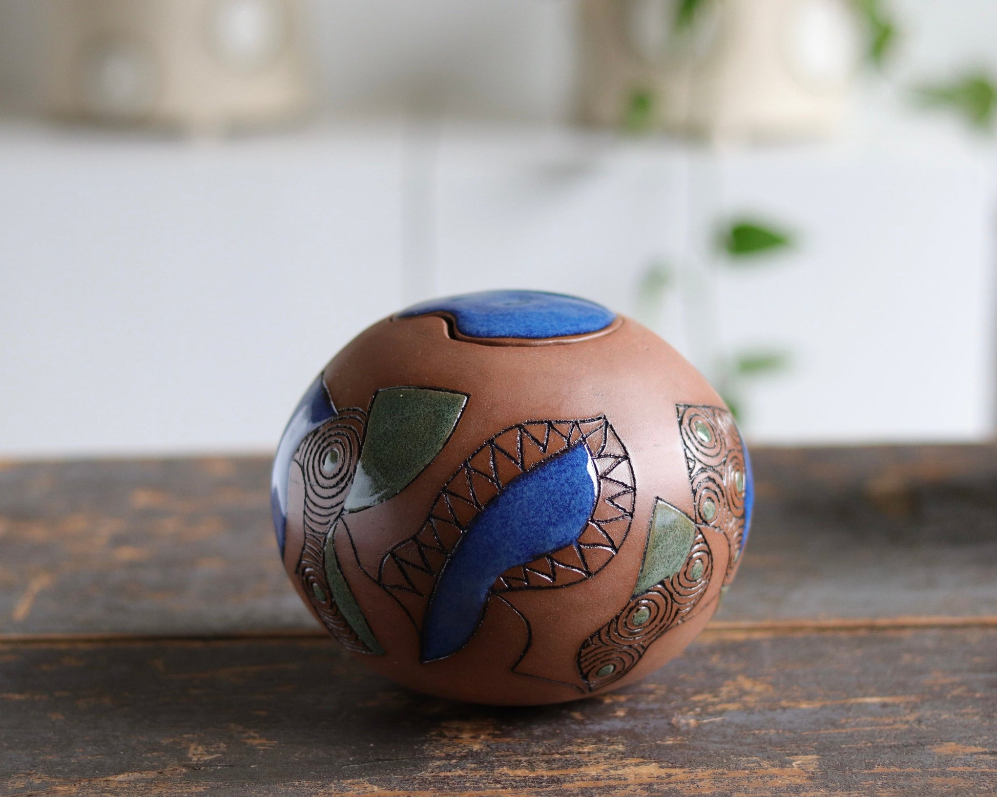 Handbuilt and as unique as your animal companion. I use both slab and coiling method, and the lid is made to fit snugly. This special urn will continue to be a joyful reminder of your departed companion.