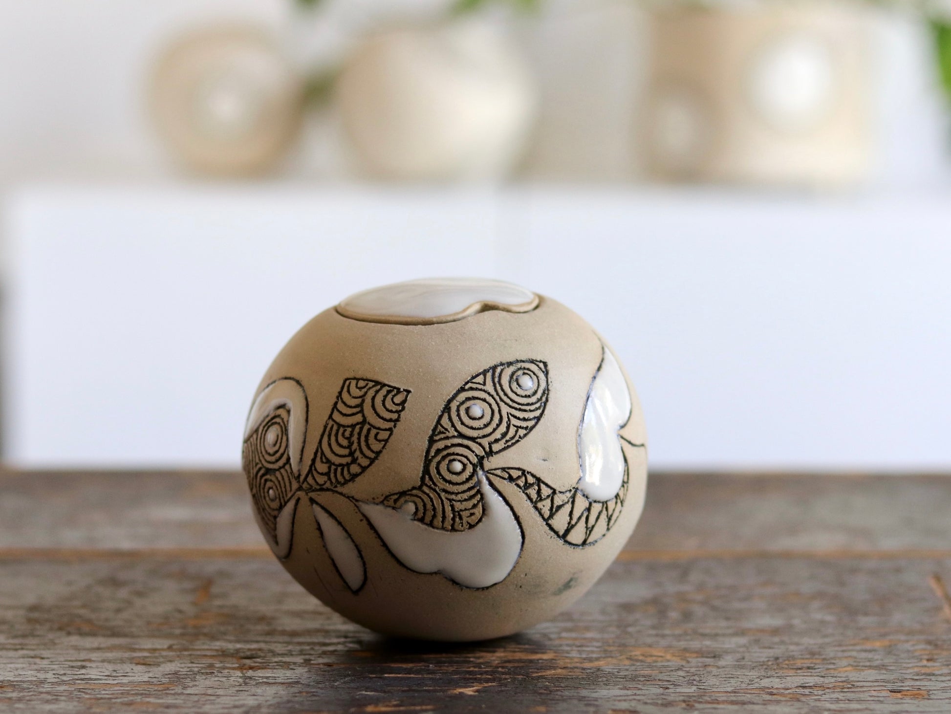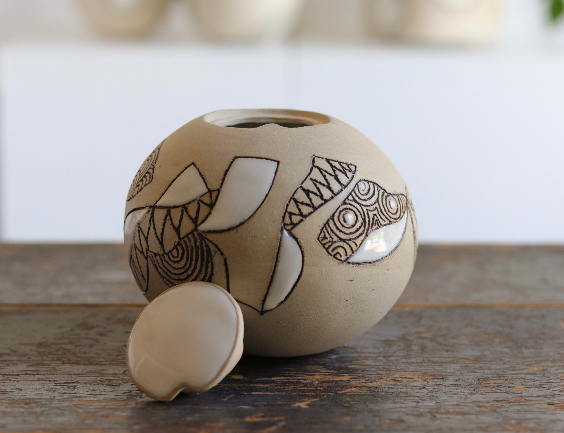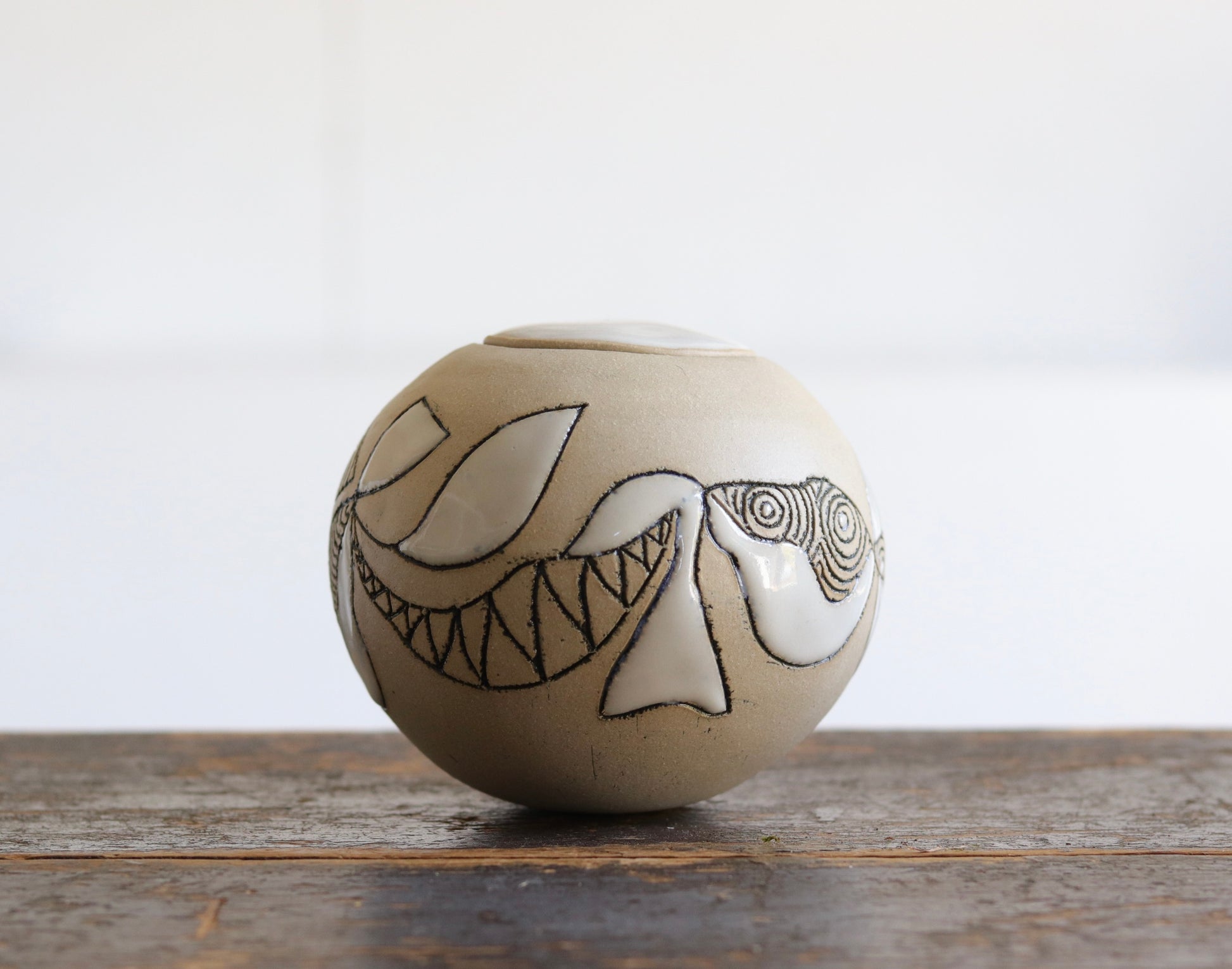 Urn - Abstract Design - White Stoneware w Glazed Lid