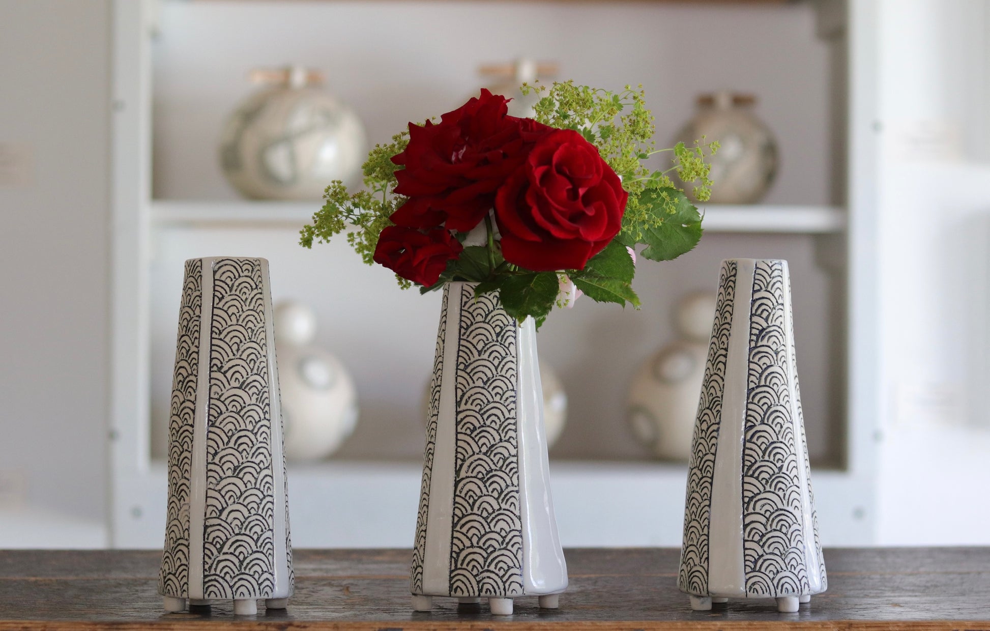 This series of vases with their slightly wider base and narrower opening at the top work really well for single stems or smaller bouquets. They come in various heights and make an impressive grouping.